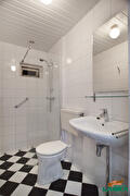 Das Badezimmer ist mit einem Waschbecken, einer Dusche und einer Toilette ausgestattet.