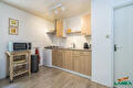 Die offene Küche ist ausgestattet mit einer Kombi-Mikrowelle, einer Senseo-Kaffeemaschine, einem Wasserkocher und einem Kühlschrank mit Gefrierfach.