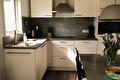 The open kitchen is equipped with a dishwasher, oven, Senseo coffee maker, kettle, and fridge with freezer compartment.